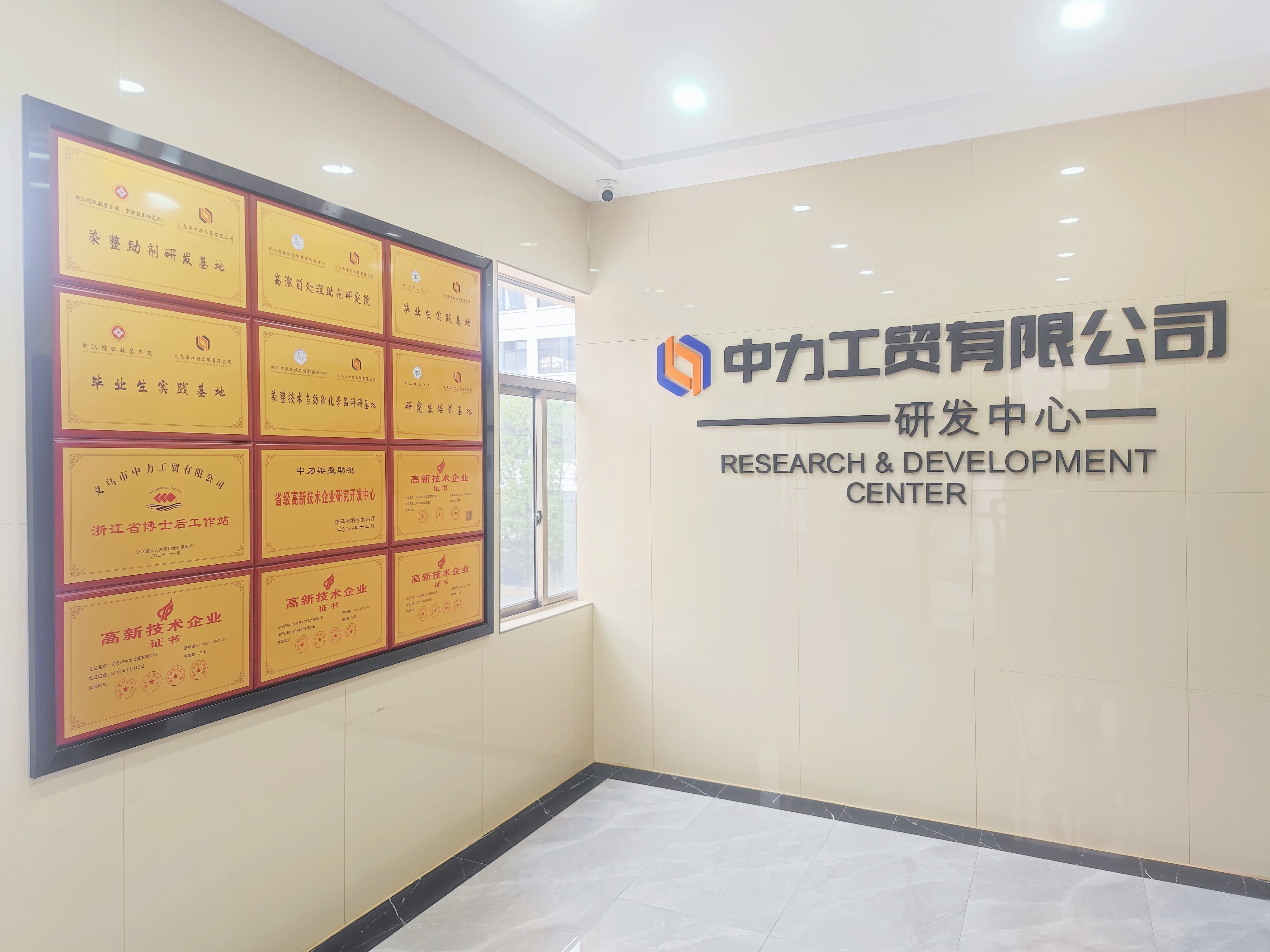 义乌市中力工贸有限公司成立于1998年,是一家专业从事研究开发、生产经营各种染化助剂的国家高新技术企业。拥有先进的生产设备,一流的技术专家,优秀的管理团队。公司地处义乌市佛堂镇,建筑面积10000平方米,是目前浙中地区规模最大的染整助剂生产研发基地。拥有固定资产13200万元,现有职工60余人,其中科技人员15人,拥有设备、仪器配套完善的省级企业研发中心。公司于2002年被义乌市科技局授予“义乌市科技型中小企业”;2008年公司被授予《省级高新技术企业研究开发中心》;2010年12月被认定为国家火炬计划重点高新技术企业, 2011年被认定为浙江省高新技术企业;2011年公司通过ISO14000:2008环境管理体系认证和ISO9001:2008质量管理体系认证。2012年,和浙江理工大学联合组建了《浙江理工大学研究生实验基地》、《浙江理工大学—中力化学 印染助剂研发中心》。近几年来公司与东华大学、浙江理工大学,浙江纺织服装学院,上海纺织研究院,常州化工研究院等大专院校、科研单位紧密合作,引进技术、引进人才,针对市场新需求,不断应用新技术,新工艺开发新产品。